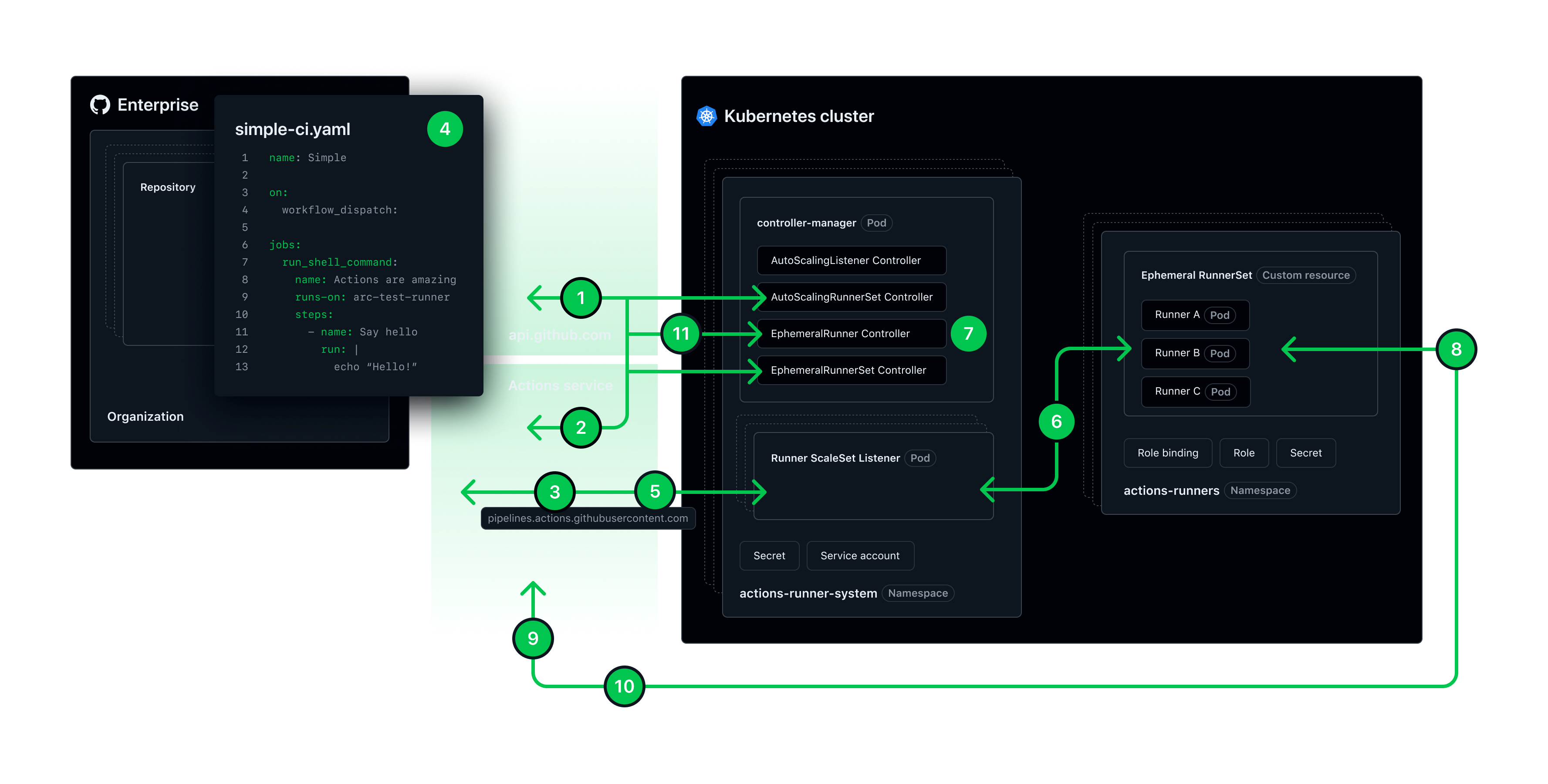 With ARC, you can create runner scale sets that automatically scale based on the number of workflows running in your repository, organization, or enterprise. Because controlled runners can be ephemeral and based on containers, new runner instances can scale up or down rapidly and cleanly.