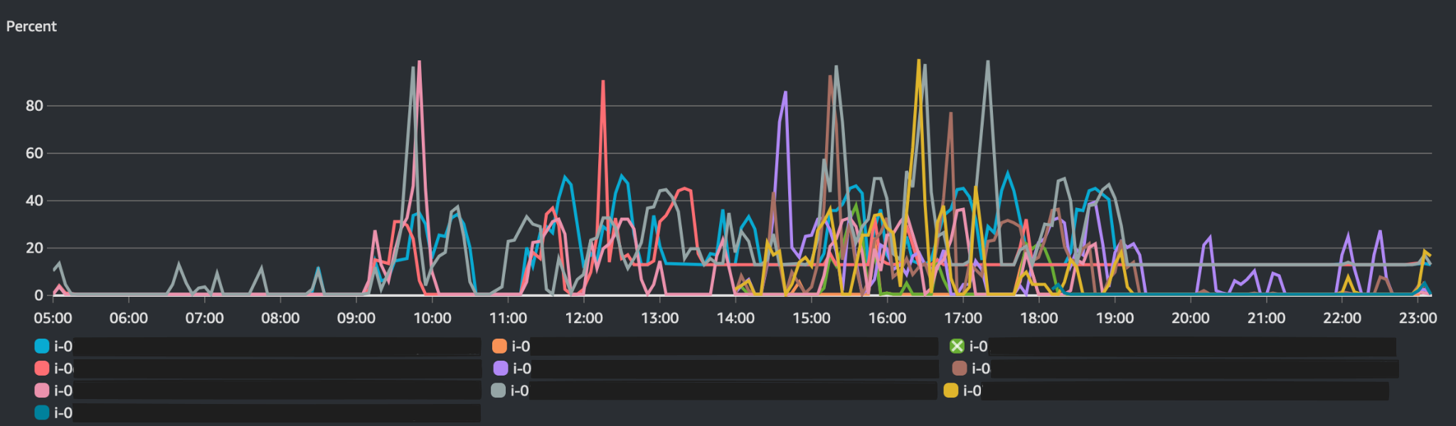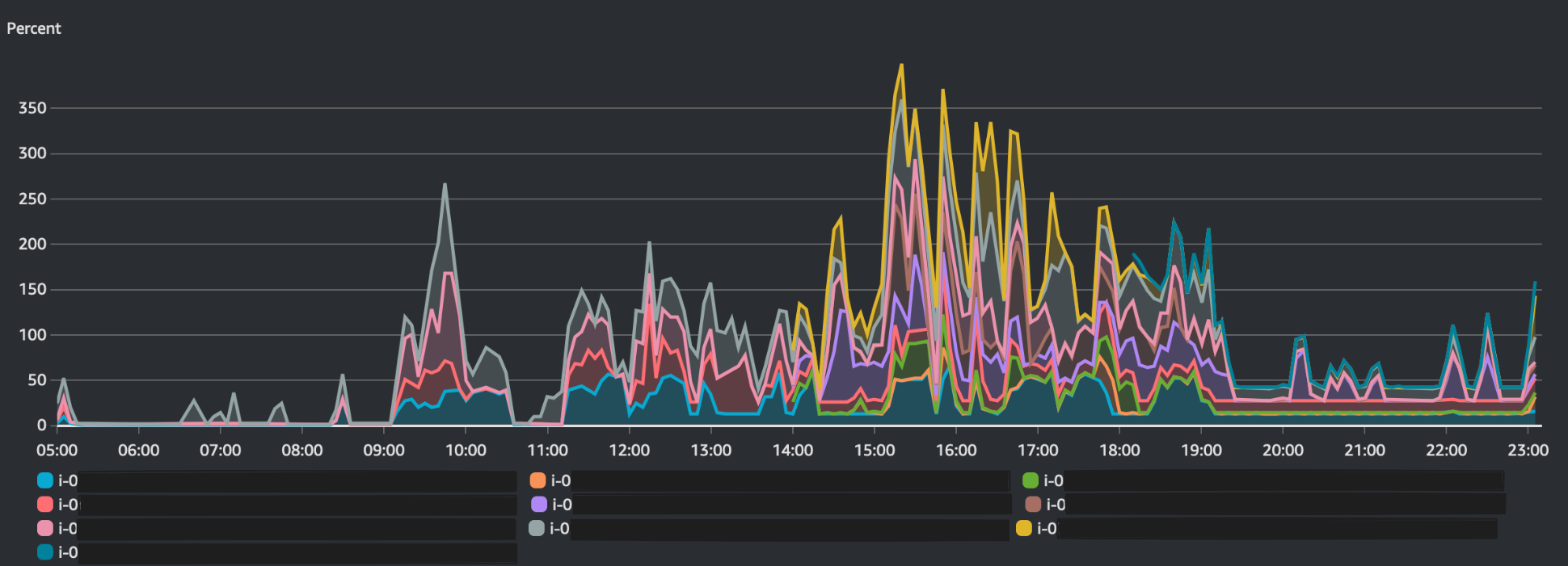 The graph below shows the same CPU usage but with stacked average area of 10 Build Runners on Thursday, July 4, 2024. Note the maximum possible value for 10 instances is 1000%: