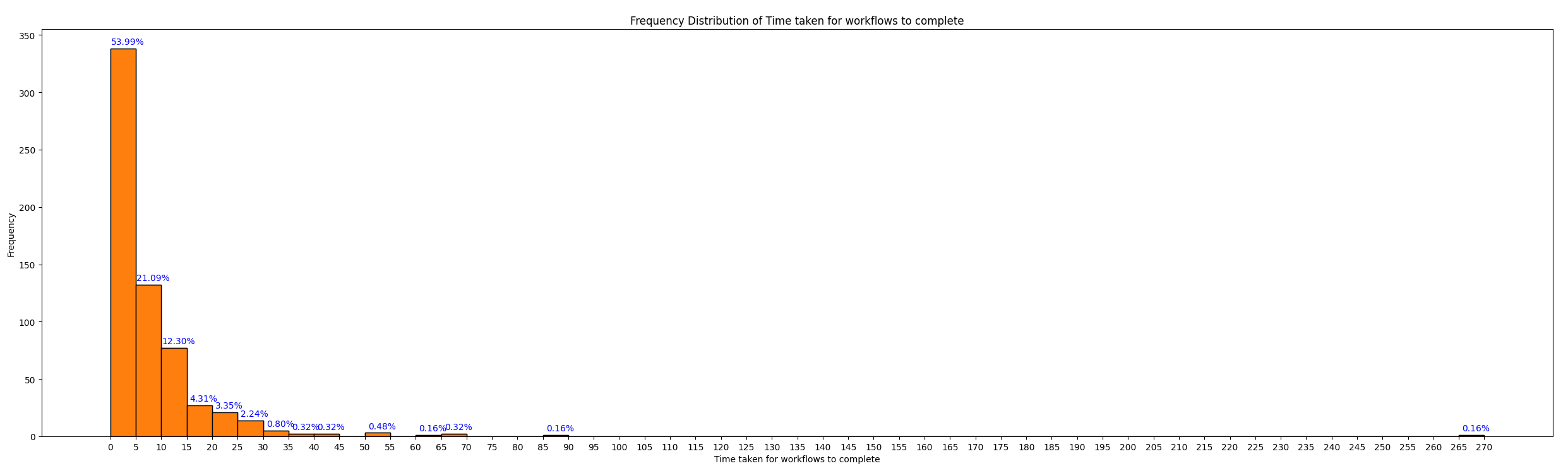 We have used a total of 74,575 minutes = 1,242.92 hours = 51.79 days of workflow time. Which is equivalent to running ~2 instances for 24 hours, or ~4 for 12 hours. We add 40% to our result to account for reduced capacity and idling, and we reach 6 instances for 12 hours, which aligns with my generous calculations in the CloudWatch section.