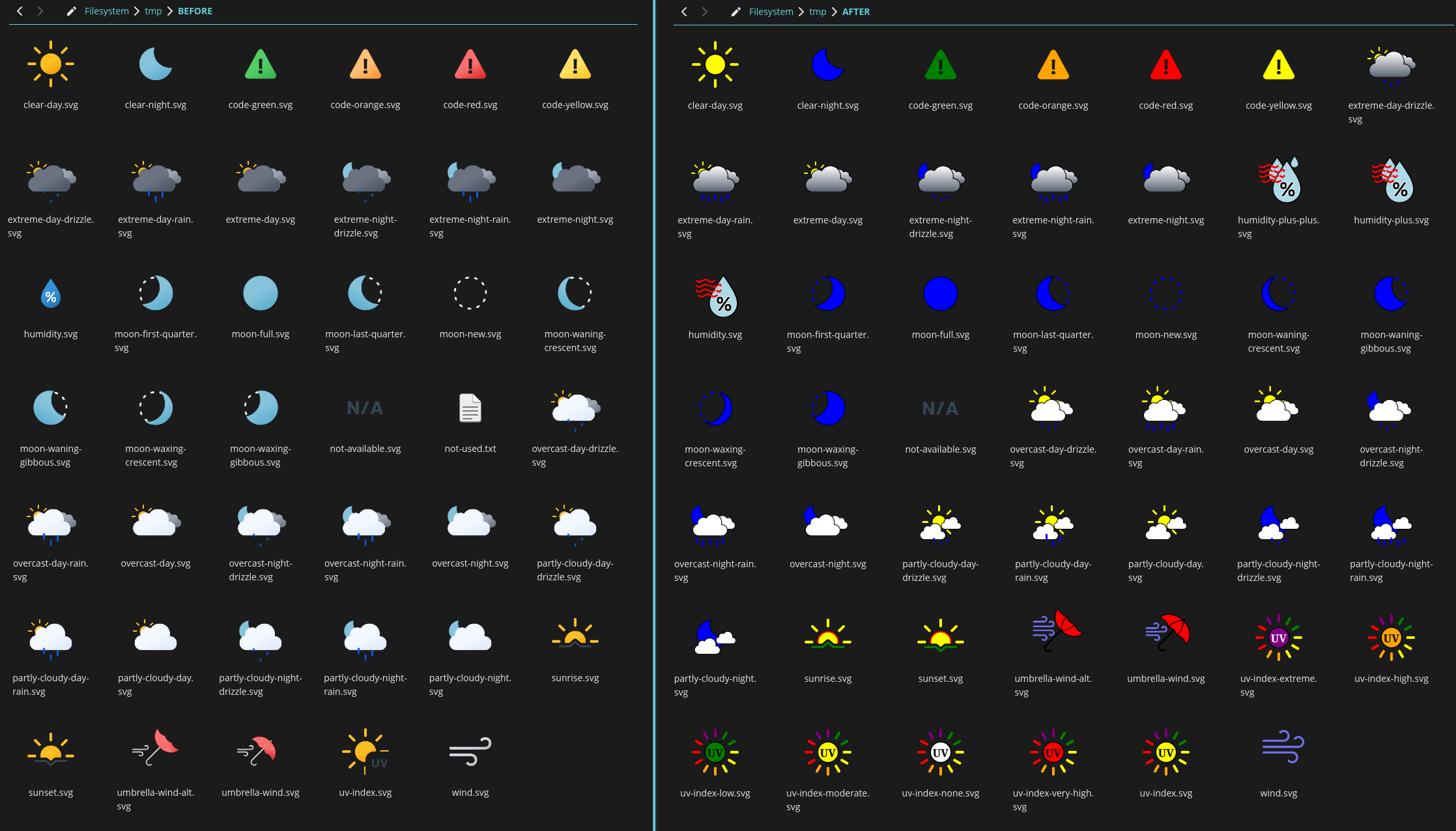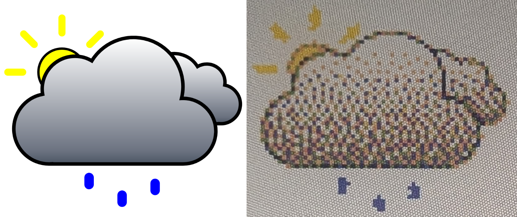 I have intentionally chosen gradients in some of the icons to force dithering, such as portraying heavy clouds.