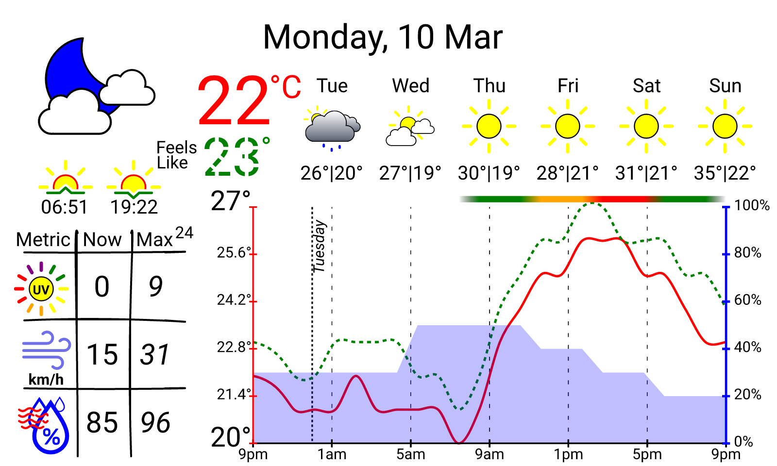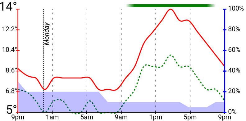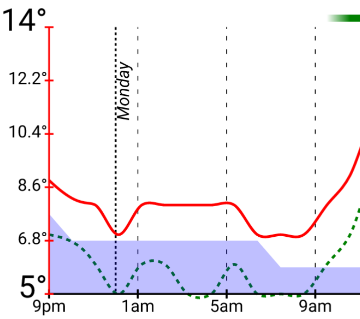 There is a small problem though, given the y-axis bounds are dictated by the actual or feel like temperature, when interpolating the points, the curve might slightly overshoot outside the bounds axis bounds(top and bottom), I have yet to find an algorithm that is smooth and only overshoots in the x dimension.